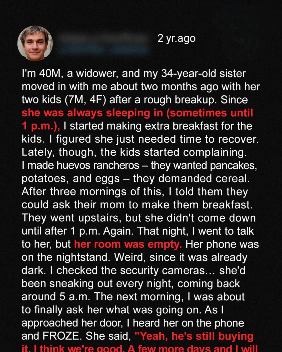 So I built a quiet life. Mornings were mine. Nights too. It wasn’t exciting, but it was peaceful. Until two months ago, when Jenny, my 34-year-old sister, called just after midnight. She was crying so hard I couldn’t even understand her at first.