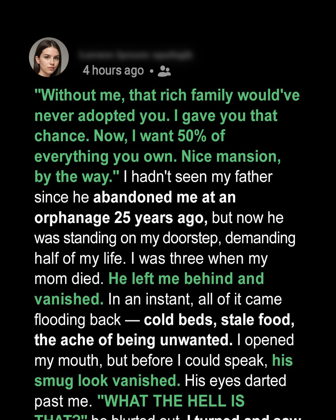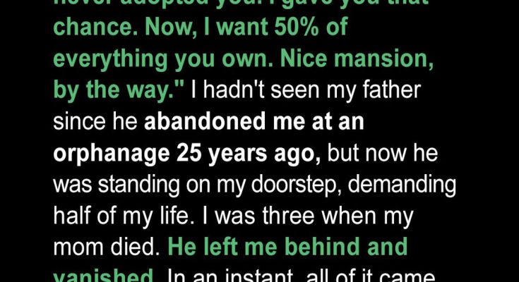 “Oh, don’t play dumb,” he said, leaning against the doorframe like he had every right to be there. “Without me, you wouldn’t be here. You wouldn’t have been adopted by that rich family of yours. I gave you that chance by letting you go. And now it’s time you paid me back. I want fifty percent of everything you own.” His hand swept dramatically over the entryway. “I like this mansion you’re living in.”
