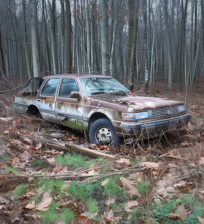 An old, rusty car lay abandoned in a small clearing, partially covered by foliage. It looked like it had been there for years.