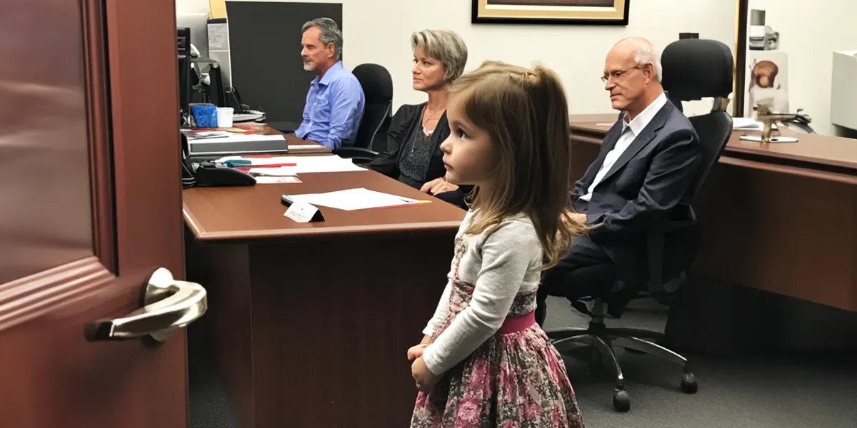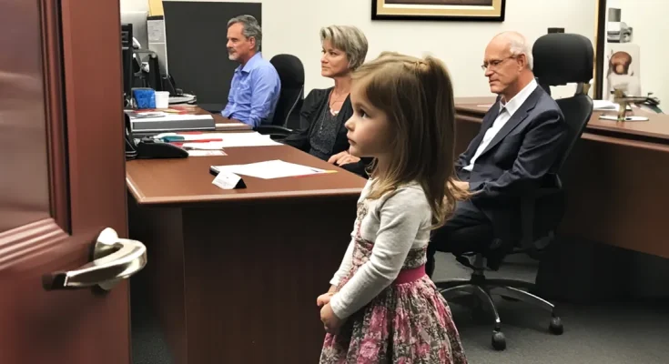 The room was filled with uneasy silence as Mr. Alaric shuffled his papers, the sound of crisp pages echoing in the tense atmosphere. Mr. Lewis’ children and grandchildren sat impatiently, their eyes darting from each other to the little girl standing quietly beside the lawyer.