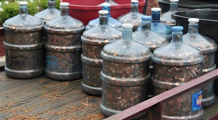 They brought the gallons to the bank and the employees had a fun day experiencing something they’ve never done before. They cut out the pennies out of the water jugs using a hammer and an ax. After five hours of cutting and counting on the coin-counting machine they had a number.