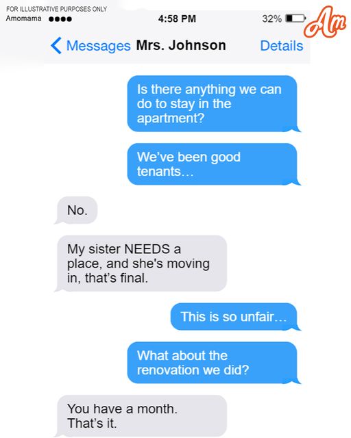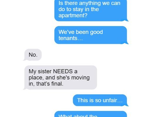 “My sister, Lisa… she’s in a bit of a bind. She lost her job and her apartment, and she has nowhere else to go. I’ve thought long and hard about this, but I’ve decided she’ll be moving into your apartment. I’m so sorry, but I need you and Chris to move out in a month.”