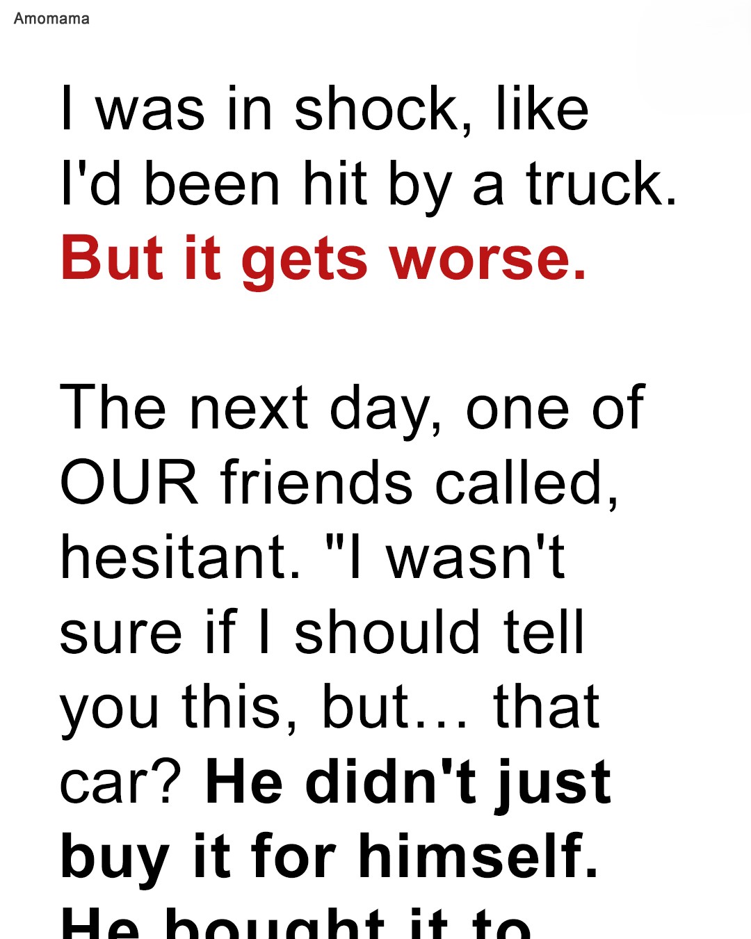 “The worst part?” she continued. “He’s already bragging about it to the guys. Saying she’ll finally see what she missed out on once she sees him in that car.”
