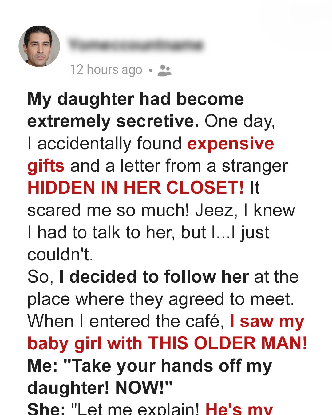 Bobby discovered a hidden stash of expensive gifts in his teenage daughter’s closet, along with a photo of an unknown older man and a note about a café meeting. He discreetly followed her to the café, unaware he’d uncover a secret that would tear his family apart.