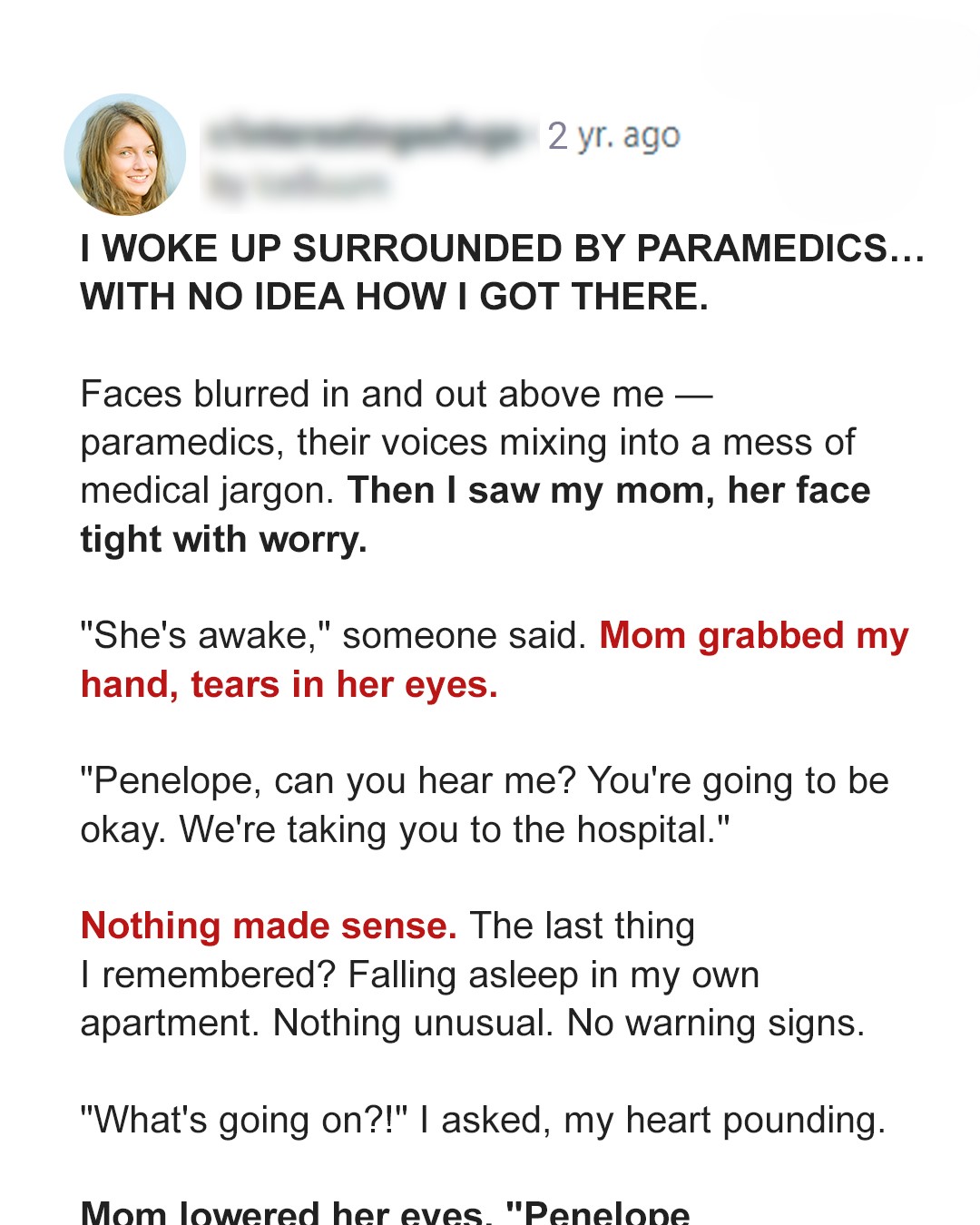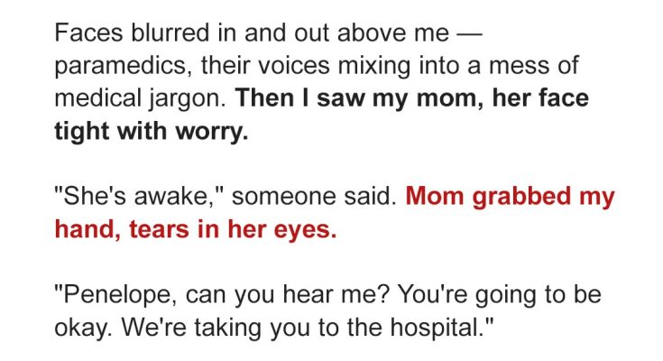 Faces swam in and out of focus above me. Paramedics in uniform, their voices a garbled combination of medical jargon. And my mother, with her face etched with worry, was peering down at me.
