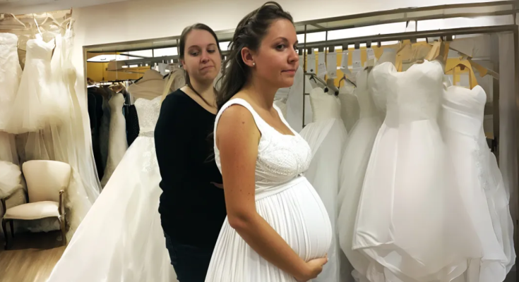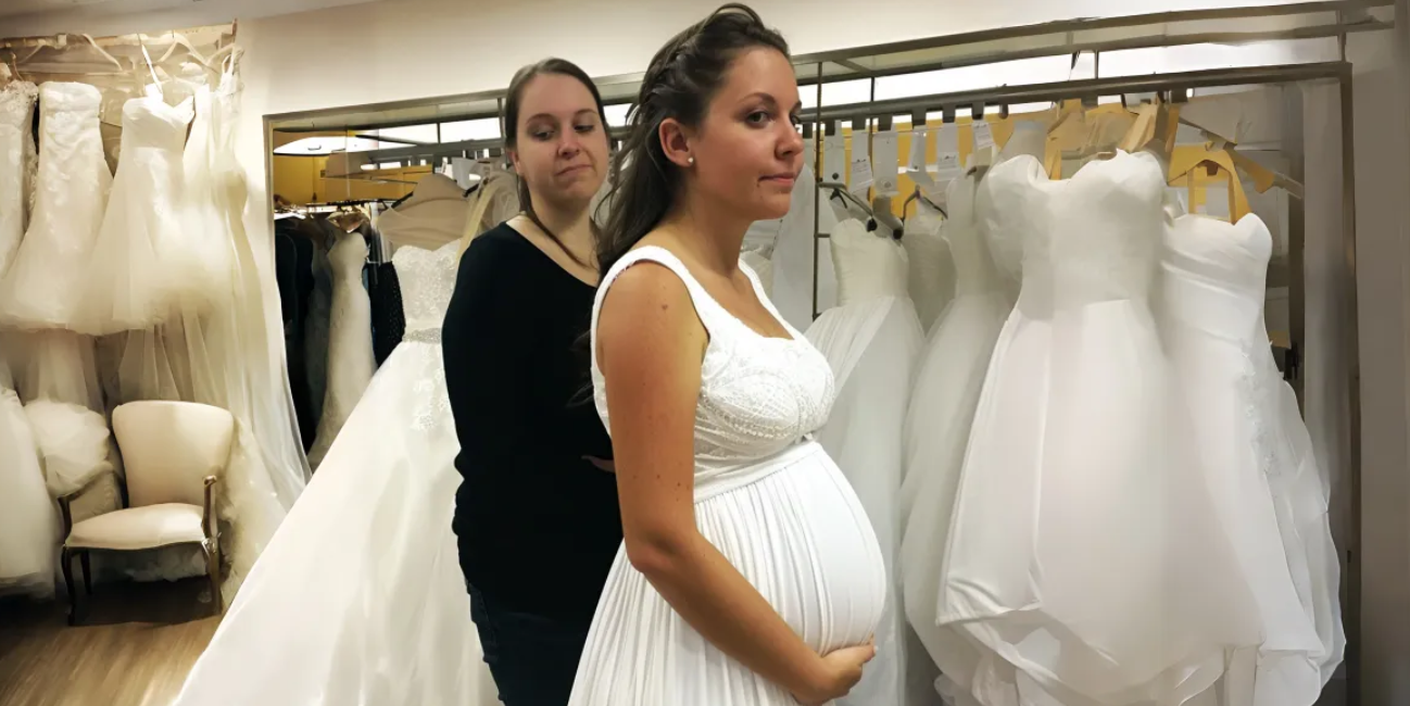 I took a deep breath and returned to the fitting room, this time feeling a renewed sense of purpose. I found another gown—simple yet stunning, with a soft flow that draped perfectly over my belly. As I looked at myself in the mirror, I finally saw the bride I had imagined, glowing with happiness.