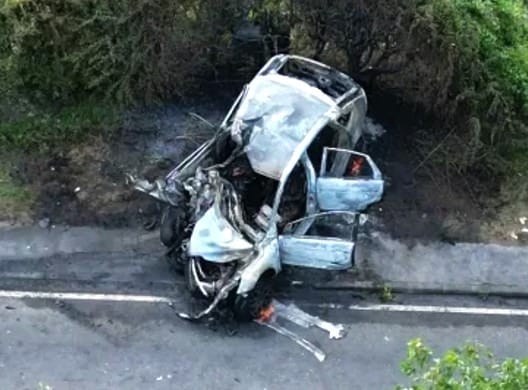 Pictures taken right after the terrible crash show the burned-out wreckage of the family’s car.