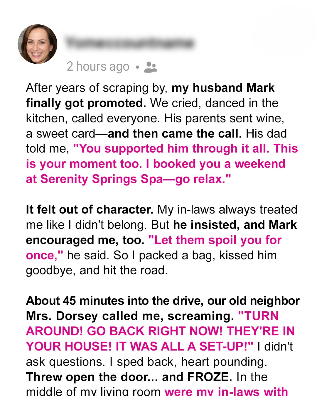 When my father-in-law offered to send me on a luxury spa weekend, I thought maybe my in-laws were finally trying to include me. I was halfway to the resort, driving in peace, when my elderly neighbor called, screaming for me to turn back. What I saw when I got home shook me to my core.